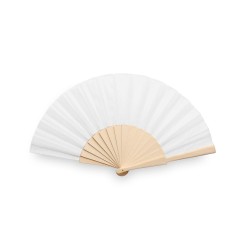 Abanico de línea nature con varillas fabricadas en resistente madera de acabado natural. Tela en resistente poliéster 190T, disponible en variada gama de colores y presentado en una caja de cartón individual blanca.