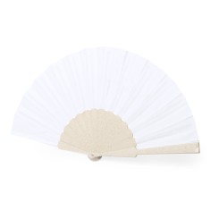 Abanico de línea nature, con varillas de fibra de bambú y tela en RPET, elaborado a partir de plástico reciclado, para así fomentar la reutilización de residuos plásticos y ayudar a la sostenibilidad del planeta. Presentado en caja individual de diseño eco.