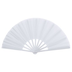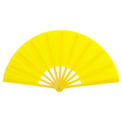 Abanico tamaño maxi con varillas de plástico y tela en poliéster de variados colores. Presentado en caja individual.
