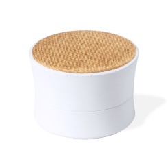 Altavoz Bluetooth de tamaño compacto y 3W de potencia. Combinación de cuerpo en ABS blanco con rejilla de poliéster en variada gama de colores. Batería de litio de 300mAh, con cable de carga Tipo C incluido. Presentado en caja individual de diseño kraft, con manual de instrucciones en español e inglés.