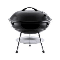 Barbacoa fabricada en resistente acero al carbono de acabado en negro. Tapa con cómoda asa y orificios de ventilación, con parrilla metálica, plato antigoteo y pies antideslizantes. Presentada en atractiva caja de diseño.