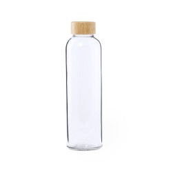 Bidón transparente de cristal de 500 ml de capacidad, con tapón a rosca en bambú y libre de BPA. Presentado en atractiva caja de diseño kraft.