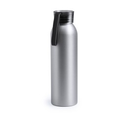Bidón de aluminio de 650 ml de capacidad. Cuerpo en color plateado, con tapón de seguridad a rosca en variada gama de colores transparentes. Cinta de transporte en material TPR a juego.