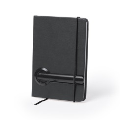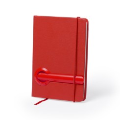 Bloc de notas con tapas rígidas de suave tacto acabadas en polipiel de vivos colores y con bolígrafo a juego integrado en portada. Con 80 hojas de distribución a una raya, elástico de sujeción y marcapáginas de tela a juego.