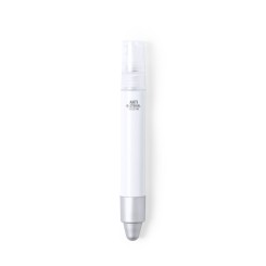 Bolígrafo antibacteriano con pulverizador recargable integrado y capucha protectora con puntero en color gris. Acabado liso en resistente ABS brillante con detalles cromados y escritura en tinta azul. Capacidad del pulverizador 3ml. Líquido no incluido.Los productos con tratamientos antibacterianos son capaces de reducir drásticamente las cargas bacterianas presentes en las superficies de los materiales, gracias a la incorporación de agentes microbianos permanentes estáticos, con alta efectividad para inhibir y prevenir la contaminación bacteriana.Artículo de acuerdo al estándar ISO 22196, que determina la actividad antibacteriana en materiales plásticos y superficies no porosas, lo que permite conocer la efectividad de inhibición microbiana que tienen los aditivos sobre los objetos tratados mediante una evaluación cuantitativa.