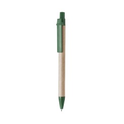 Bolígrafo de mecanismo pulsador en original combinación de cuerpo en cartón reciclado de color natural y accesorios en vivos colores. Tinta negra.