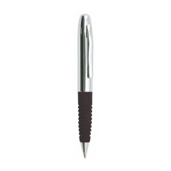Original bolígrafo de capucha metálica en elegante diseño bicolor. Con cuerpo de suave EVA en variados colores. Anillas y punta en plateado. Tinta azul.