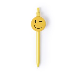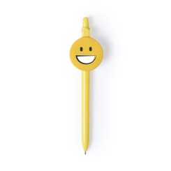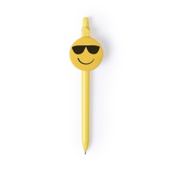 Bolígrafo de divertidos diseños emoji en llamativo color amarillo. Con mecanismo pulsador, de suave cuerpo en acabado brillante y original clip circular. Tinta azul.
