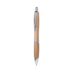 Elegante bolígrafo de mecanismo pulsador con cuerpo en madera de bambú natural, accesorios de acabado metálico en color plateado brillante y clip troquelado. De cartucho jumbo y tinta azul.