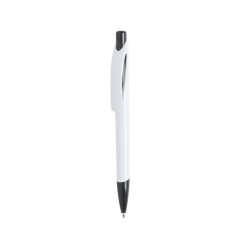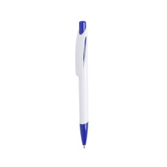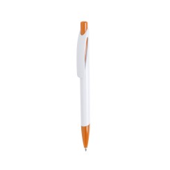 Bolígrafo de mecanismo pulsador de atrevido diseño bicolor con accesorios en vivos colores sólidos y cuerpo de suave acabado en color blanco sólido. Con original clip curvado a y punta a juego. Tinta azul.