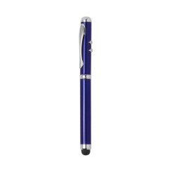 Bolígrafo láser metálico en elegante acabado brillo, con pulsadores de activación laterales para funciones láser y linterna (pilas de botón incluidas). En tinta azul, con puntero táctil integrado, cierre de capucha y clip cromado. Especialmente diseñado para marcaje en láser. Presentado en un elegante estuche metálico en caja individual de cartón de acabado plateado. Interior en suave esponja troquelada, con pilas de recambio.