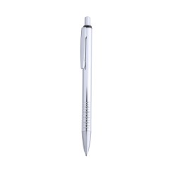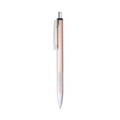 Bolígrafo de mecanismo pulsador de elegante diseño en colores plateado y dorado. Con cuerpo en aluminio de suave acabado, accesorios y anillas en plateado. Original clip en plateado, de cartucho jumbo y tinta azul.