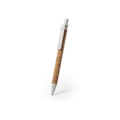 Bolígrafo con mecanismo pulsador de línea nature. Cuerpo en corcho natural, con accesorios en caña de trigo, para así fomentar la utilización de materias primas naturales y reducir las emisiones contaminantes. En tinta azul.