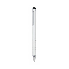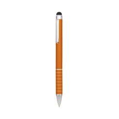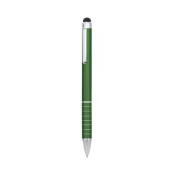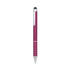 Bolígrafo puntero de mecanismo giratorio con cuerpo en aluminio de suave acabado metalizado en vivos colores. Accesorios y anillas en color plateado. Original empuñadura anillada y tinta azul.