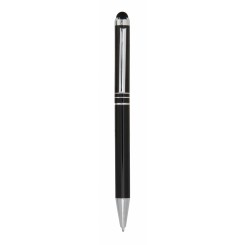 Bolígrafo puntero de mecanismo giratorio con cuerpo en aluminio de suave acabado metalizado en variados colores. Accesorios y anillas en color plateado. Tinta azul.