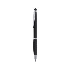 Bolígrafo puntero de mecanismo giratorio de elegante diseño bicolor con accesorios en color plateado brillante y cuerpo de suave acabado en llamativos colores metalizados brillantes. Con clip metálico y anilla a juego. Suave empuñadura de original diseño y tinta azul.