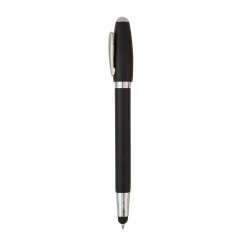 Bolígrafo puntero de mecanismo giratorio de sobrio diseño bicolor con accesorios en elegante color plateado y cuerpo de suave acabado metalizado en vivos colores. Clip metálico y tinta azul.