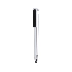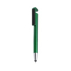 Bolígrafo puntero multifunción de mecanismo pulsador en desenfadados colores y con clip de doble función especialmente diseñado para servir como soporte para dispositivo móvil y también como limpiador de pantalla. Con cuerpo en acabado metalizado, especialmente diseñado para marcaje en tampografía y tinta negra.