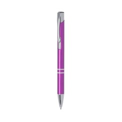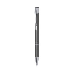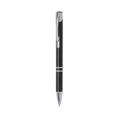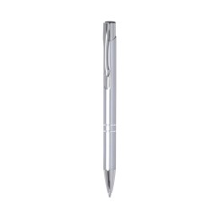 Original bolígrafo de mecanismo pulsador en elegante diseño bicolor. Con cuerpo troquelado en aluminio de suave acabado en variados colores. Original clip, anillas y punta en plateado. De cartucho jumbo y tinta azul.