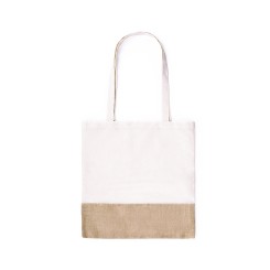 Bolsa ecológica en resistente combinación de materiales naturales -yute y algodón- de 245g/m2. Con atractivo diseño bicolor y acabado cosido. Asas largas de 70 cm reforzadas y resistencia hasta 8kg de peso.