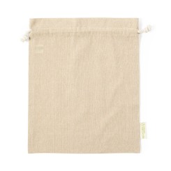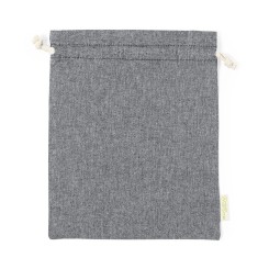 Bolsa eco-friendly en resistente material 100% algodón reciclado GRS de 120g/m2. Certificación GRS (Global Recycled Standard / Estándar de Reciclaje Global), que garantiza el origen reciclado del material usado para fabricar el producto. Cierre de cordón de algodón y acabado cosido, incluye etiqueta exterior con distintivo algodón reciclado.