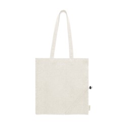 Bolsa plegable de línea nature, fabricada en algodón reciclado de 120g/m2. De acabado cosido y con asas largas reforzadas (70 x 2,5cm). Plegado de pequeño tamaño mediante cordón con accesorio de ajuste. Disponible en variada gama de colores, con distintivo algodón reciclado en etiqueta exterior. Resistencia hasta 6 kg de peso. Certificación GRS (Global Recycled Standard / Estándar de Reciclaje Global), que garantiza el origen reciclado del material usado para fabricar el producto