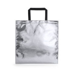 Bolsa en non-woven laminado de acabado metalizado. Disponible en colores dorado, plateado y oro rosa. Con asas medianas reforzadas de 42 cm de largo. De acabado termosellado, con fuelles y ribetes reforzados. Resistencia hasta 7kg de peso.