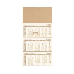 Calendario de pared de línea nature, fabricado en cartón reciclado. Con diseño trimestral, incluye accesorio indicador del día. Con agujero para colgar en la pared y amplia superficie de marcaje.