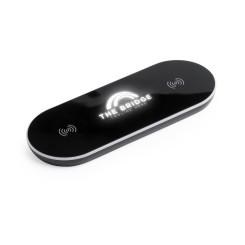 Cargador inalámbrico para carga simultánea de hasta 2 dispositivos. En elegante color negro, con luz led interior y un recubrimiento exterior especialmente diseñado para marcaje en láser, con el que conseguirá que su publicidad o marca quede iluminada con luz blanca. Base antideslizante y compatible con dispositivos equipados con tecnología de carga inalámbrica. Presentado en atractiva caja de diseño. Cable USB incluido.