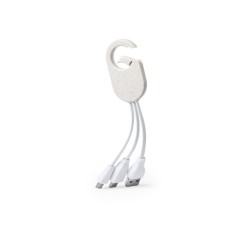 Cable cargador USB de línea nature en caña de trigo, para así fomentar la utilización de materias primas naturales y reducir las emisiones contaminantes. Con conexiones tipo C y dual micro USB/Lightning. Con mosquetón de ajuste y zona lisa para marcaje. Presentado en atractiva caja de diseño eco.