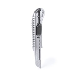 Cutter en combinación de materiales acero inox y aluminio con cuchilla ancha y mango ergonómico troquelado. Capucha extraíble para ajuste de corte de cuchilla.