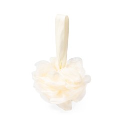 Suave esponja de baño en fibra de PE, con cinta de sujeción a juego y amplia superficie de marcaje.