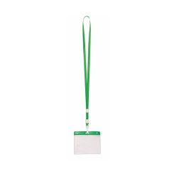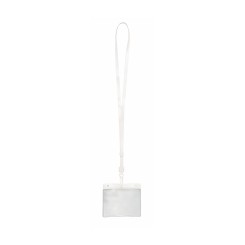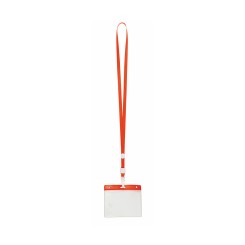 Identificador en PVC con lanyard a juego en vivos colores y con cierre de mosquetón. Pastilla circular para marcaje.