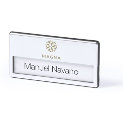 Identificador en acabado brillante. Parte trasera con doble sistema de fijación -pinzas de enganche metálicas e imperdible- para un ajuste seguro.
