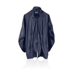 Impermeable en resistente PVC de acabado termosellado en variada gama de colores. Con capucha de cremallera integrada en cuello, cierre principal de cremallera y con bolsillos laterales. Convertible en riñonera con cintas elásticas y cierre de buckle a juego. Disponible en tallas M-L, XL-XXL.