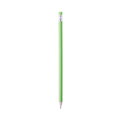 Lápiz de madera de acabado brillo. Con cuerpo redondo y goma de borrar a juego. Disponible en variada gama de colores. Mina negra y punta afilada.