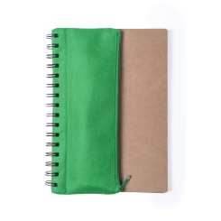Libreta de anillas con tapas de suave tacto acabadas en resistente cartón reciclado. Con estuche en poliéster 600D de vivos colores y cierre de cremallera integrado en portada. Incluye bolígrafo en cartón reciclado y set de regla, lápices y sacapuntas en madera natural. 70 hojas lisas.