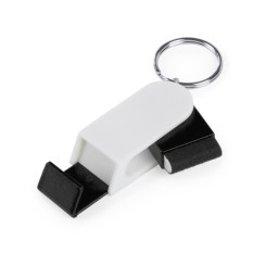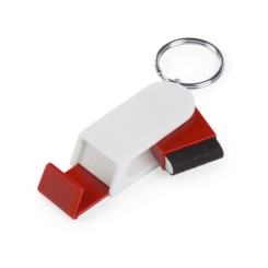 Original llavero soporte para smartphone en elegante acabado bicolor y con limpiador de pantalla de mecanismo giratorio integrado.