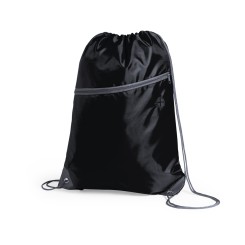Mochila de cuerdas fabricada en suave poliéster 210D. Con bolsillo frontal de cremallera y salida de auriculares. Cuerdas de autocirre en color gris, a juego con cremallera y esquinas con argollas metálicas y refuerzo de polipiel. En variada gama de colores.