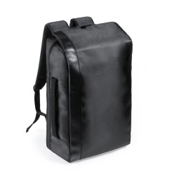 Elegante mochila fabricada en resistente poliéster con detalles en polipiel. Con gran solapa frontal y compartimento principal con cierre de cremallera de doble tirador. Interior con bolsillos acolchados para tablet de hasta 12 pulgadas y ordenador portátil de hasta 17 pulgadas. Asa de transporte lateral acolchada y accesorio de ajuste en trolley, con bolsillo antirrobo en parte trasera. Espalda y cintas de hombros acolchadas y ajustables.