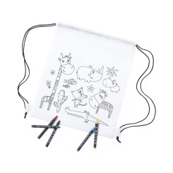 Mochila de non-woven en color blanco especialmente diseñada para colorear con ceras. Incluye 5 ceras de cuerpo cilíndrico en variados colores. Con cuerdas autocierre en color negro y refuerzo en las esquinas.
