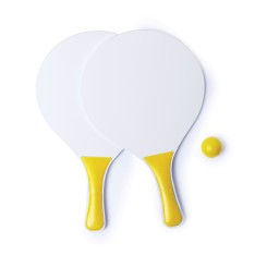 Par de palas de playa en madera natural blanca. Con mango reforzado en variada gama de vivos colores. Presentadas en bolsa redecilla con pelota a juego.