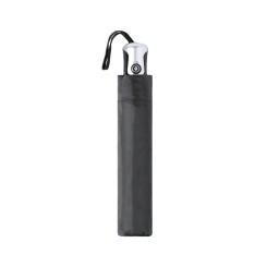 Paraguas plegable de 8 paneles y 98cm de diámetro. Tela en resistente poliéster 190T, con mecanismo automático de apertura/cierre y sistema antiviento. Varillas metálicas en color plata y fibra de vidrio. Cierre de velcro y mango ergonómico con cinta de transporte. Incluye funda a juego.