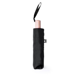 Paraguas plegable de línea nature de 95cm de diámetro. En material pongee 190T RPET, elaborado a partir de plástico reciclado, para así fomentar la reutilización de residuos plásticos y ayudar a la sostenibilidad del planeta. De apertura manual, con sistema anti viento y varillas metálicas. Mango de madera, con funda de transporte y cintas a juego. Con etiqueta distintiva RPET