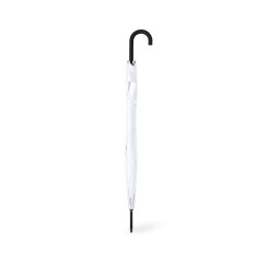 Paraguas de 8 paneles tamaño XL -130 cm diámetro-, fabricado en resistente material pongee 190T. De apertura automática y con mecanismo antiviento. Varillas de fibra en color negro, con mango curvado y cierre de velcro. Disponible en extensa gama de colores.