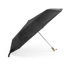 Paraguas plegable de línea nature de 103cm de diámetro. En material pongee 190T RPET, elaborado a partir de plástico reciclado, para así fomentar la reutilización de residuos plásticos y ayudar a la sostenibilidad del planeta. De apertura y cierre automáticos, con mecanismo anti viento y varillas de fibra de vidrio. Mango de bambú con botón, distintivo RPET en etiqueta y disponible en variada gama de colores. Funda RPET a juego incluida.