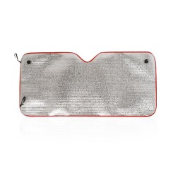 Parasol en aluminio a una cara en color plateado de acabado metalizado con ribetes de poliéster en vivos colores. De tamaño 130x60cm y espuma en el reverso. Cintas elásticas de ajuste con argollas metálicas de refuerzo, dos ventosas para ajuste en luna y presentación desplegado en plancha para fácil impresión.