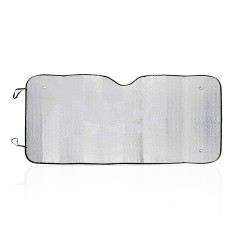 Parasol en aluminio con burbuja en ambas caras en color plateado de acabado metalizado con ribetes en color negro. De tamaño maxi 143x74cm, con argollas metálicas de refuerzo, cintas elásticas para plegado, dos ventosas para ajuste en luna y presentación desplegado en plancha para fácil impresión.