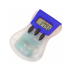 Práctico podómetro contador de pasos en original diseño bicolor con suave cuerpo translúcido, accesorios en vivos tonos y pinza de fijación. Configurable con funciones: pasos, distancia recorrida y calorías consumidas. Pila de botón incluida y presentado en caja individual.