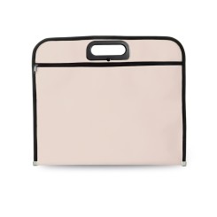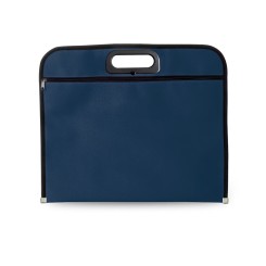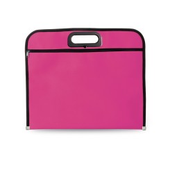 Portadocumentos de cierre de cremallera en suave acabado de poliéster 600D de vivos colores. Con asas de transporte de original diseño troquelado con refuerzo y ribetes en color negro con chapa metálica de refuerzo en la base.